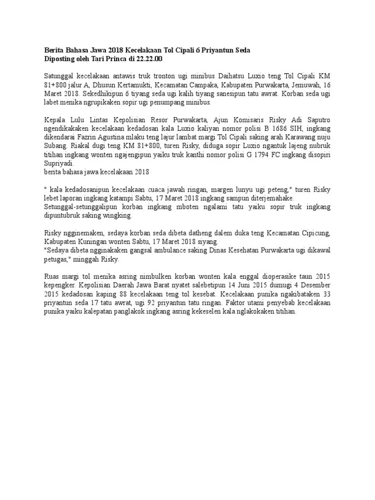 Banjir di garut belasan tewas sejumlah orang hilang bbc. Simak berita bahasa jawa 2018 tentang kecelakaan tol cipali 6 priyantun seda berikut adalah contoh pawarta bawa jawa atau teks pawarta basa jawa yang bisa kamu . Dari berbagai macam berita jawa mulai dari tema pendidikan kecelakaan bencana . Sedan terbalik di trotoar sudirman, saksi: Contoh berita bahasa jawa krama kecelakaan.